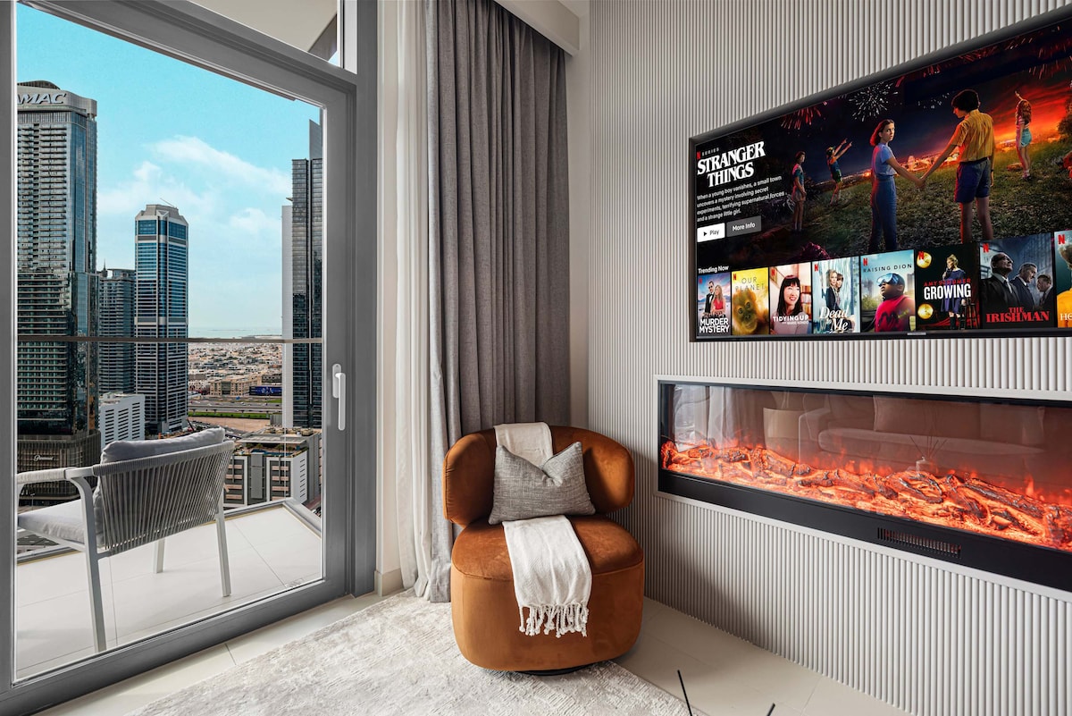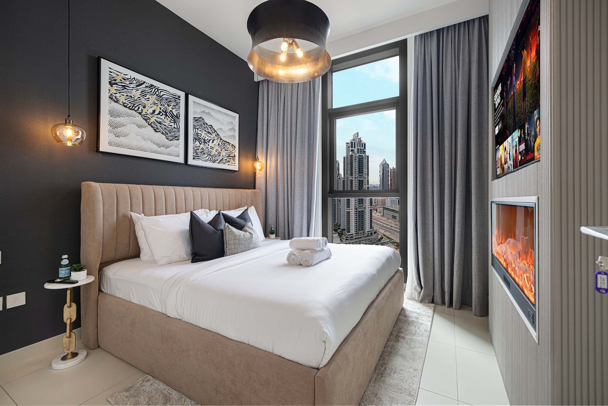 Imagine waking up to stunning sea and Downtown Dubai views from every window of your stylish 1-bedroom, 1-bathroom apartment. Whether you're traveling with family, friends, or for business, this fully equipped space sleeps up to 4 guests and is designed to make you feel right at home. Enjoy cozy evenings by the fireplace in the living room or master bedroom, unwind on the balcony, and soak in the skyline. If you're looking for comfort, space, and a touch of luxury in the heart of the city—this is the place for you.