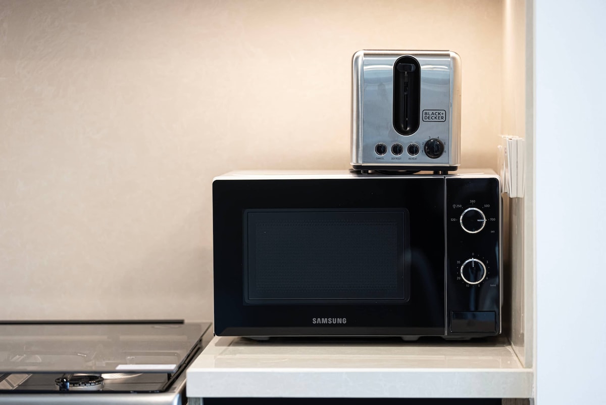 - Toaster, Microwave, Coffee Maker, and Hot Water Kettle to kickstart your mornings